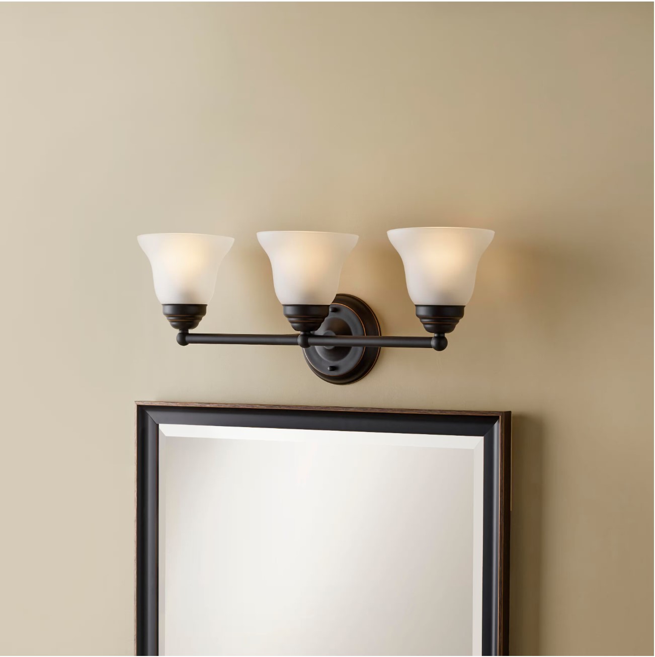 Crafted with a hand-painted, oil-rubbed bronze finish, the fixture exudes rich, earthy elegance, making it a perfect accent for cozy interiors. The three gracefully curved arms support frosted glass shades that diffuse light evenly and gently, creating a calm, flattering glow that’s ideal for daily routines or relaxing evenings.